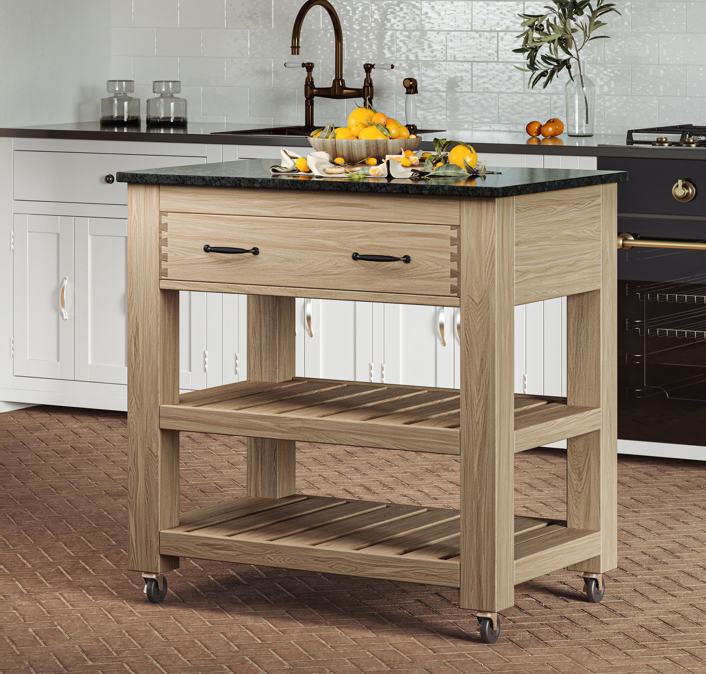 - This beautiful Oak Kitchen Island features a Black Granite top, braked wheels, Two exposed dovetail joined drawers either side, and Two open storage shelves